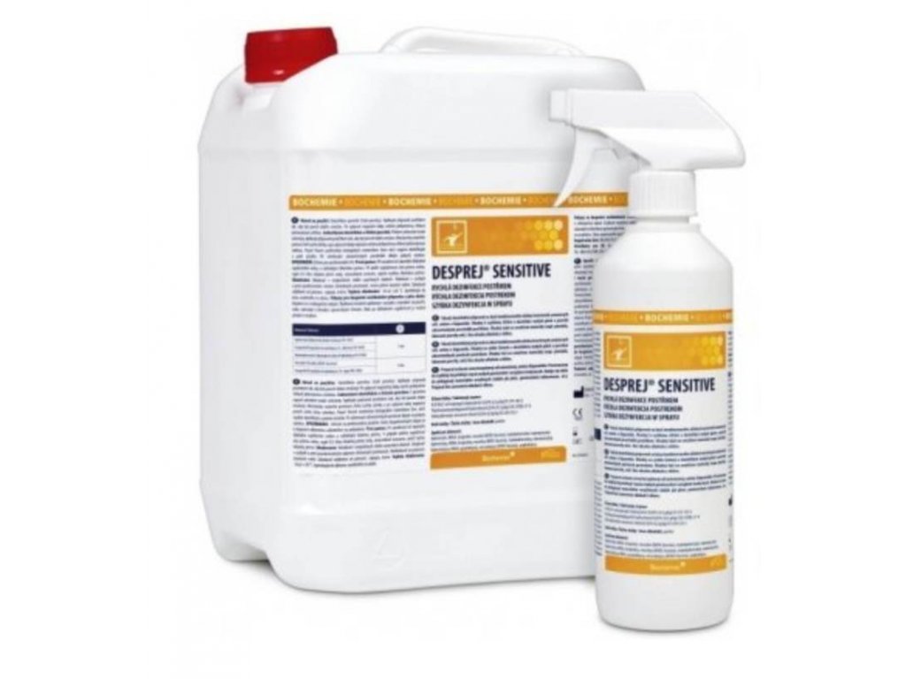 Desprej Sensitive 5L je tekutý bezalkoholový dezinfekční přípravek pro plochy citlivé na alkohol. Vhodný na plexisklo a lesklé plasty. Rychlý účinek od 1 minuty, jemně parfemovaný a okamžitě připravený k použití.